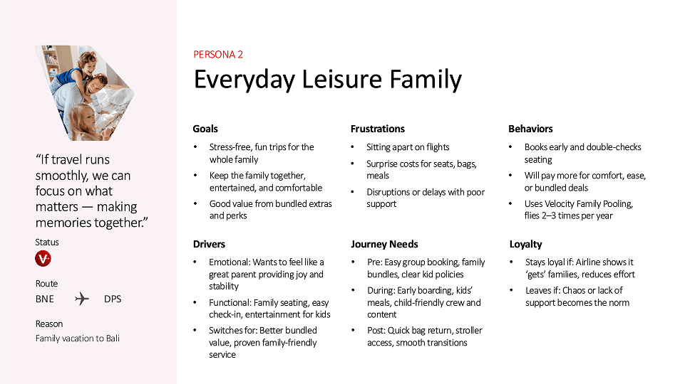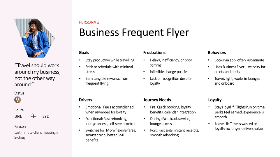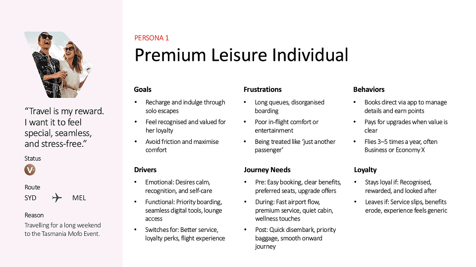 To anchor our ideas in real human needs, we created three key personas, each representing a segment Virgin serves today but doesn’t always design for intentionally.